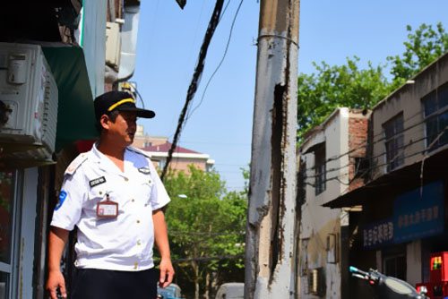 這根電線桿因何而開(kāi)裂呢?巡查到此的未來(lái)路大街巡防隊(duì)員張根生說(shuō)出了原委。